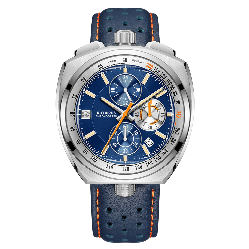 The 43.5mm classic bull head case, with curved glass, combined with a rotating inner ring and a chronograph movement which perfectly combines classical and sports.