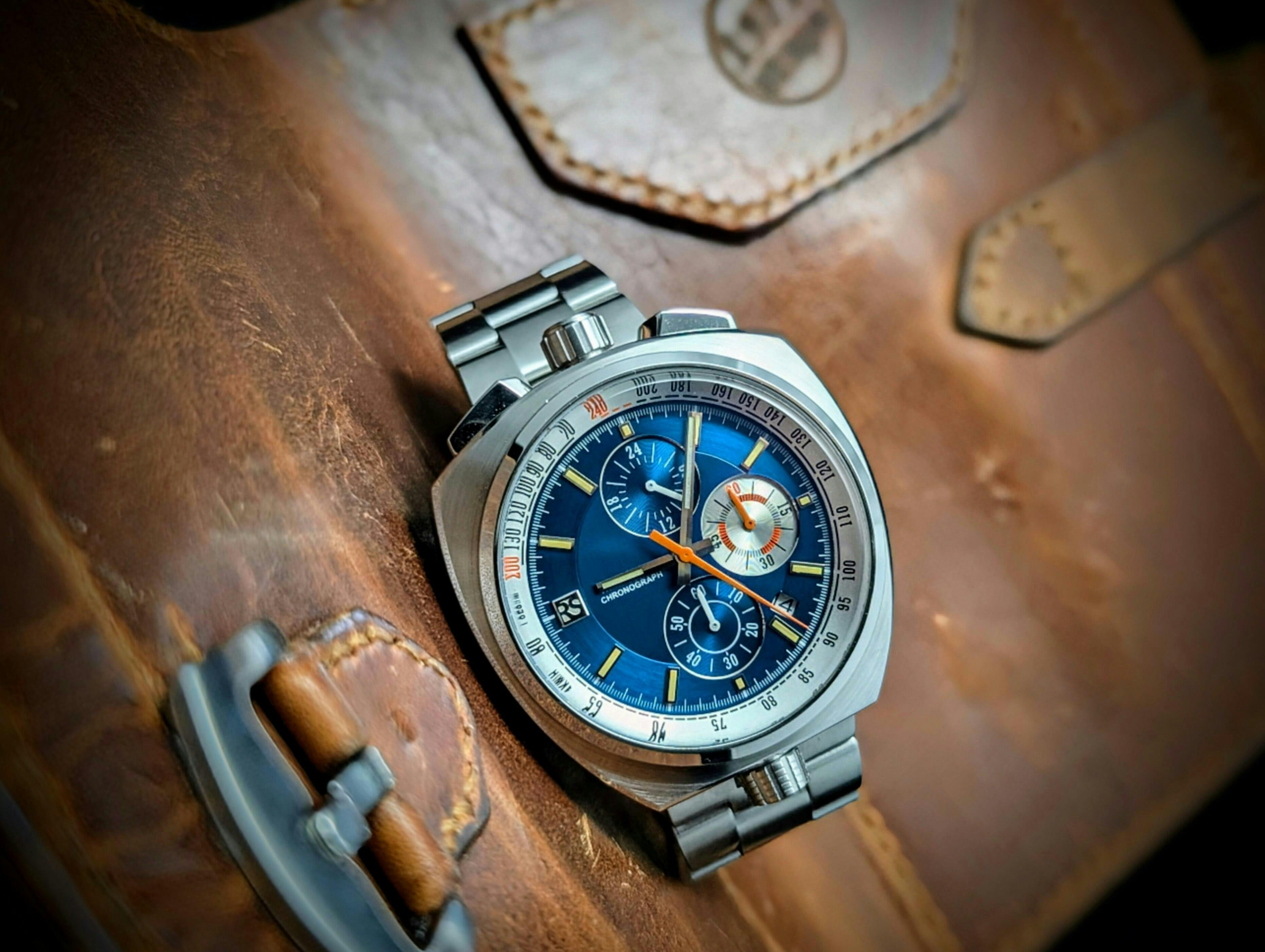 This 43.5mm classic bullhead watch, inspired by the retro 1979 design, features curved glass, a rotating inner ring, and a precise chronograph movement that perfectly combines classical elegance with sporty functionality. Paired with a breathable genuine leather perforated strap, it’s a stylish companion for your journey.